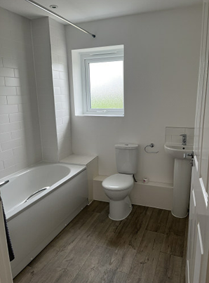 Mae’r brif ystafell ymolchi yn cynnwys bath gyda chawod dros y bath, toiled a basn golchi dwylo.