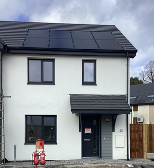 Mae’r eiddo yn elwa o baneli solar